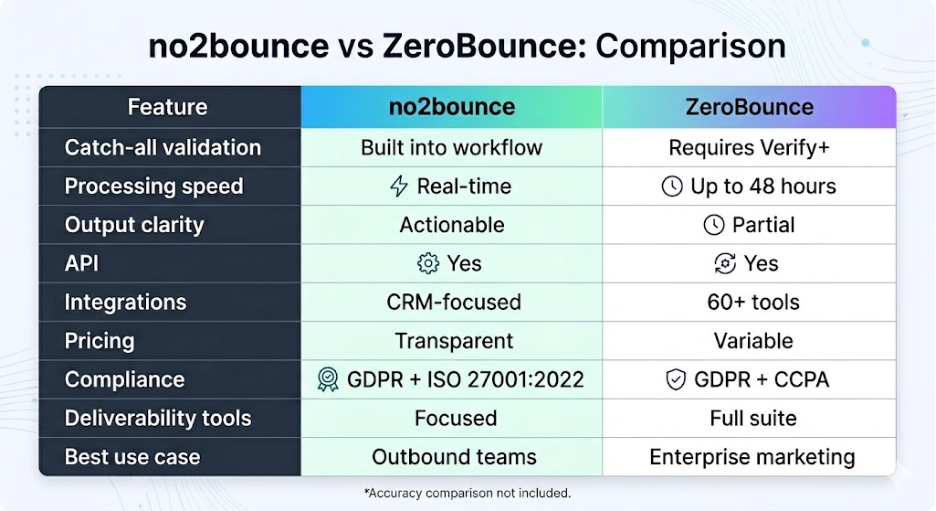 Both no2bounce and ZeroBounce are designed to solve this problem, but they take different approaches that directly impact performance.